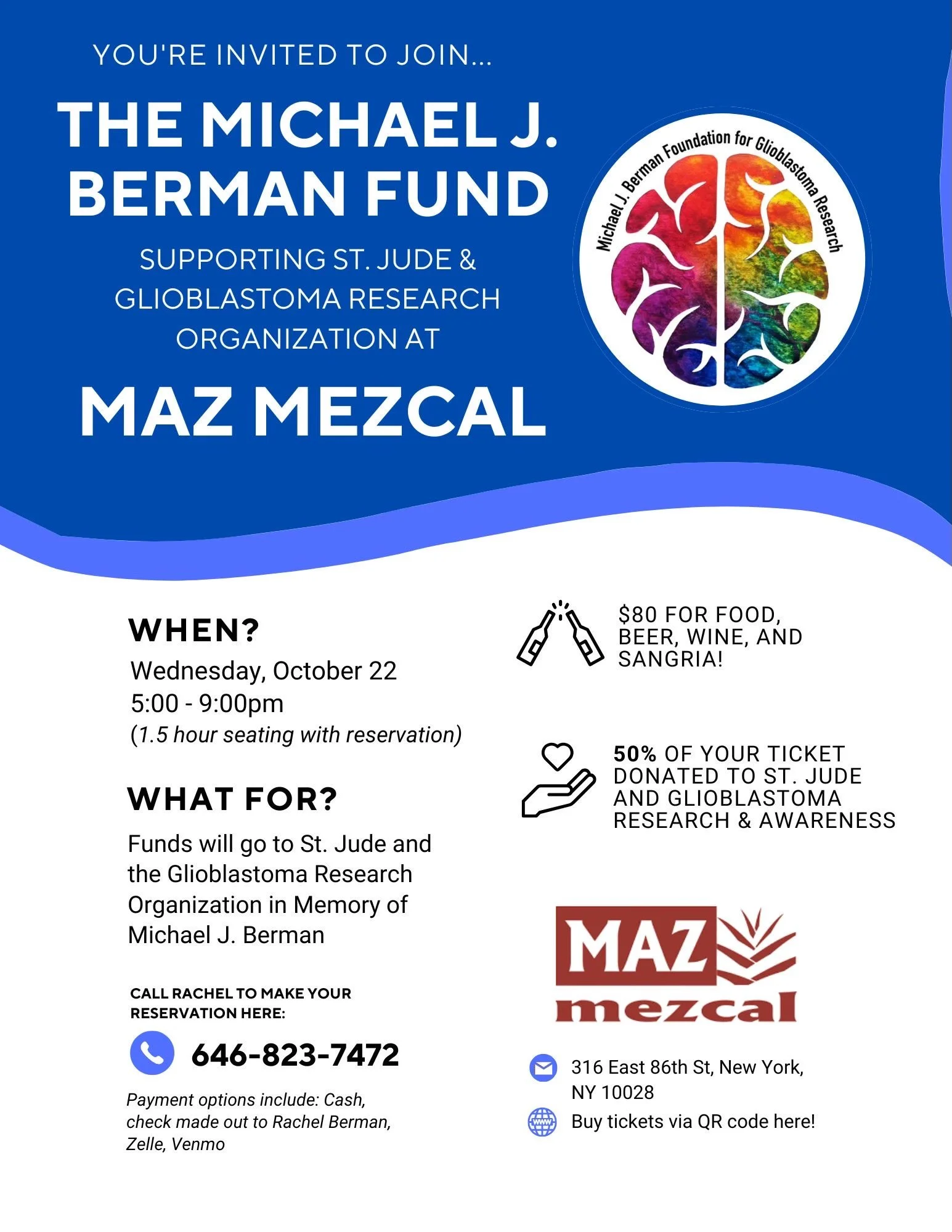 We are hosting a percentage night at Maz Mezcal on October 22 to donate funds to the Glioblastoma Research Organization. Tickets to the event will include appetizers, main courses, beer, wine and sangria. 35% of your ticket price will be donated to research projects at GBMRO. We hope to raise lots of money for a good cause and have fun while doing so! You may also make an additional donation on top of your ticket price. If you cannot attend and would still like to donate please click on the link below.