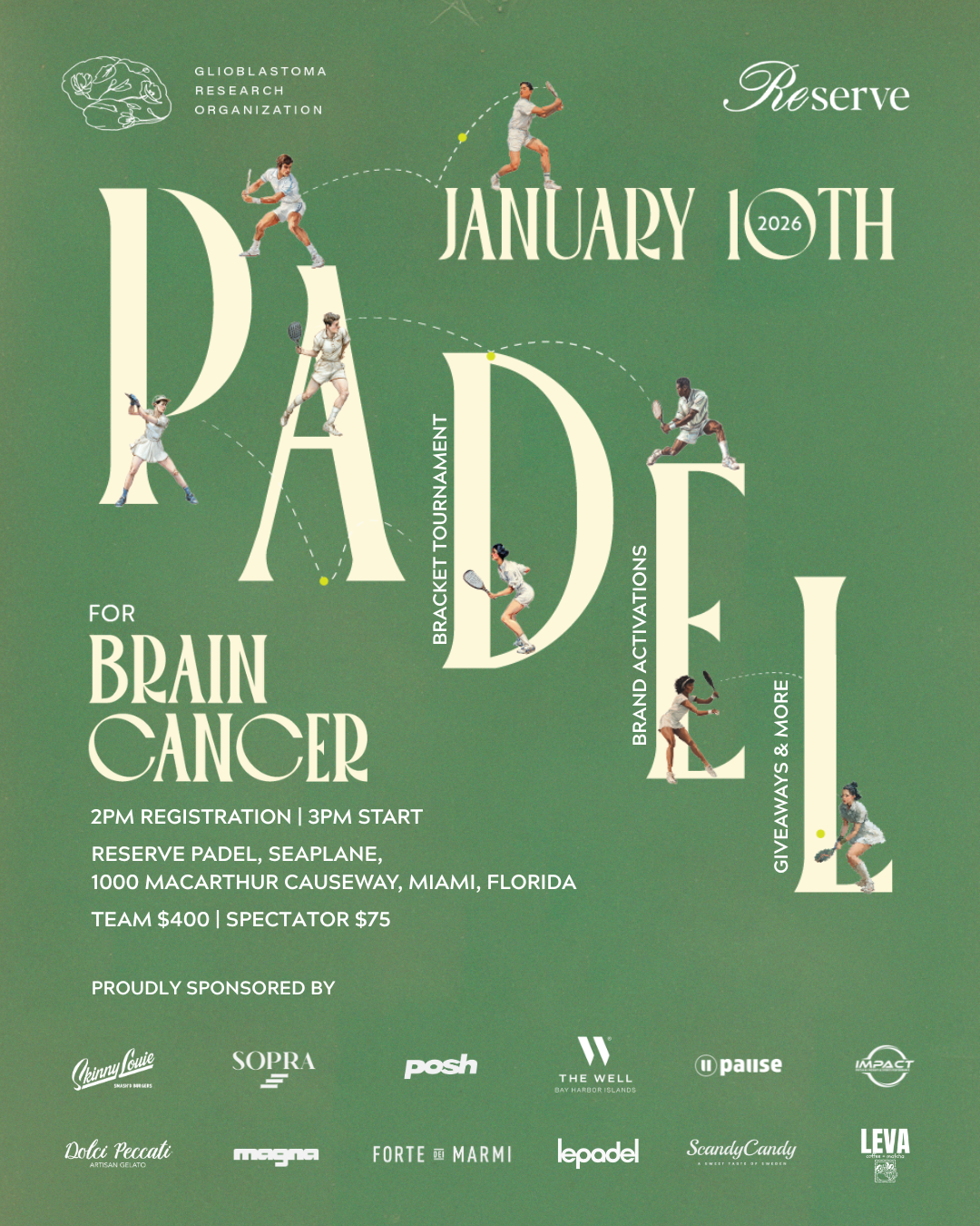 Join us for the third annual Padel for Brain Cancer Miami on Saturday, January 10, 2026. This special day brings together players, supporters, and friends for an afternoon filled with energy, connection, and purpose.